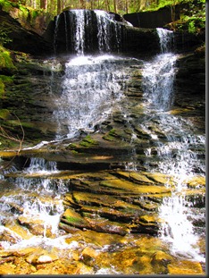 | Well, to get back to my trip… I arrived at the trailhead parking area as described in the pdf description with no problems at all and set out to discover the cascading nature of the falls that the name hinted at. After about 4 miles up a wide, well maintained, but remote trail I finally heard the falls ahead and off the trail. When I stopped to take in the beautiful shady pool and the falls however, the black flies instantly started attacking so I was forced to cut my visit short and continue back. Now is the time of year that the little black flies are a true pain and I have the marks to prove it. The falls was very enjoyable and I had a short snack and water break where I snapped a few pictures. |